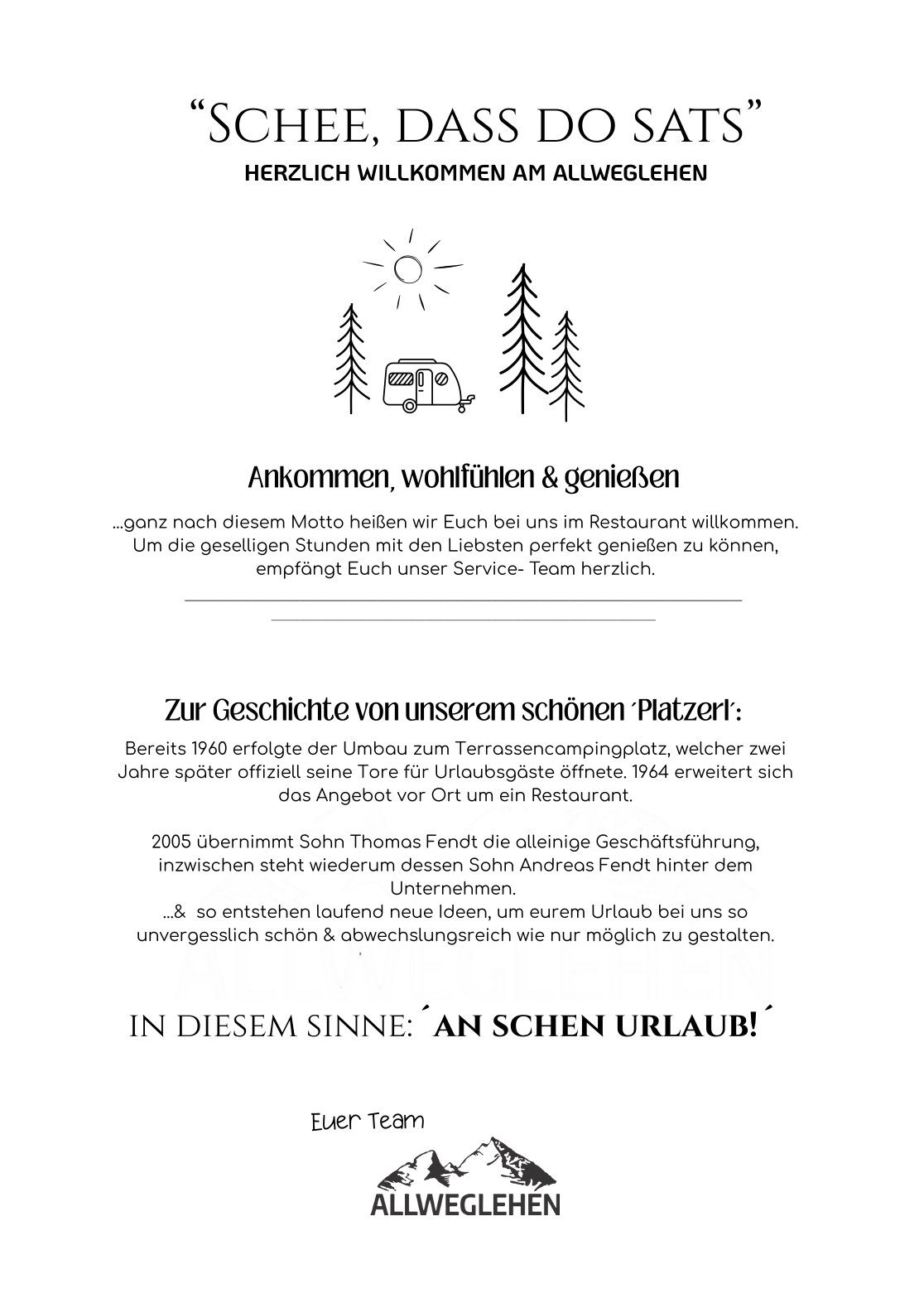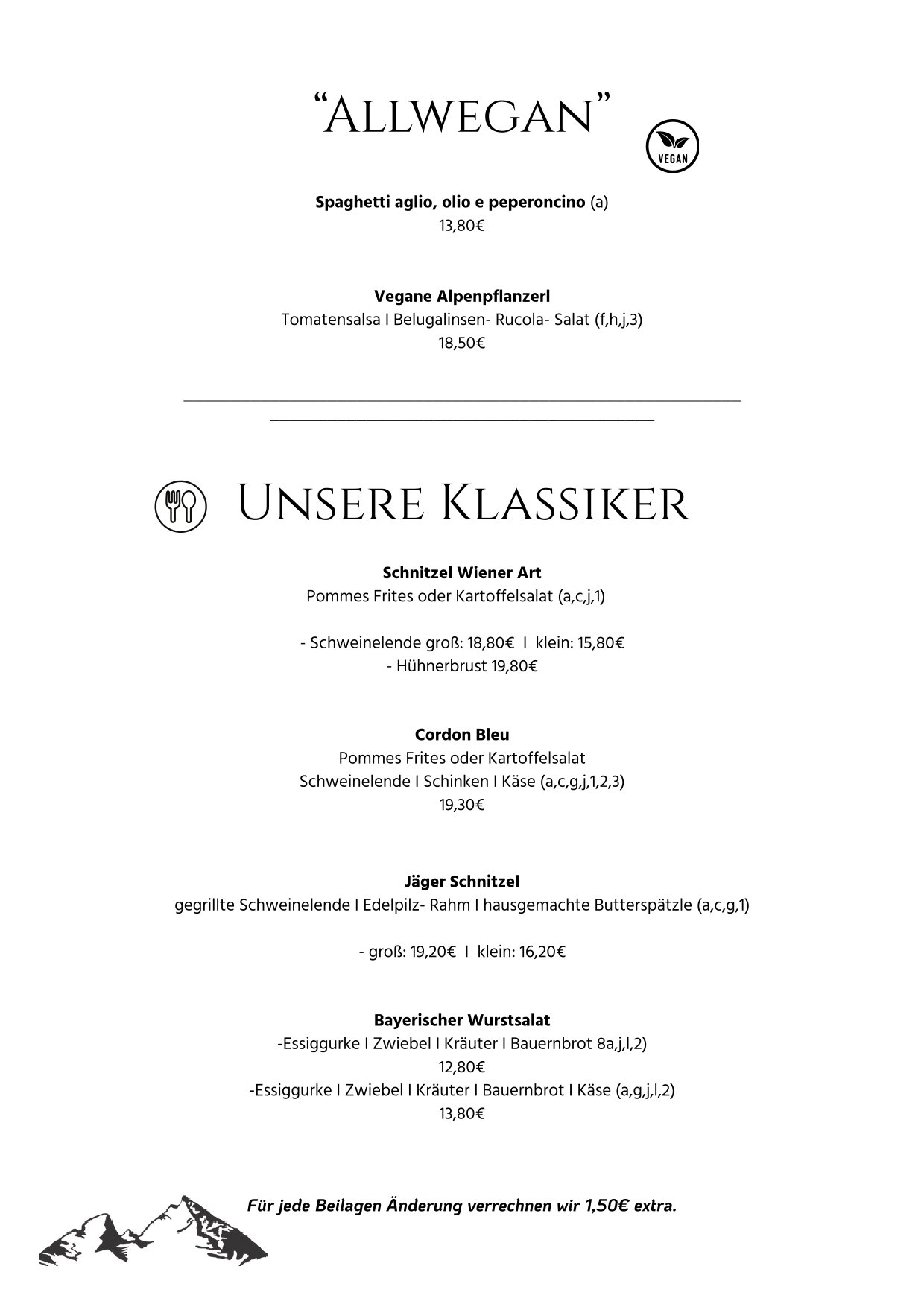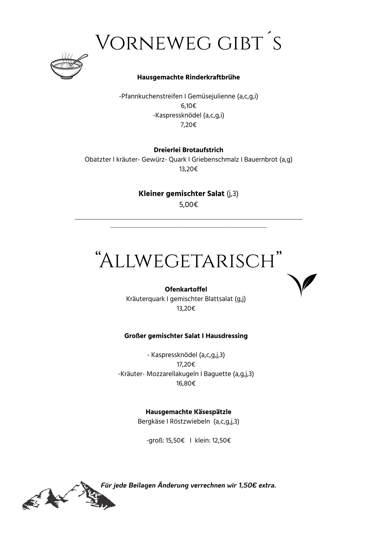 Lassen Sie sich von unserer Küchencrew verwöhnen & genießen Sie eine traditionell bayrische Küche mit einem Hauch von Moderne. Unser Serviceteam freut sich auf Ihr Kommen. (Bitte Öffnungszeiten beachten) Ob Vorspeisen, vegetarisch oder etwas Herzhaftes, das Allweglehen ist eine klare Herzensempfehlung.